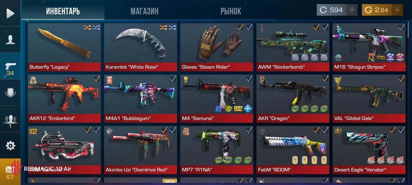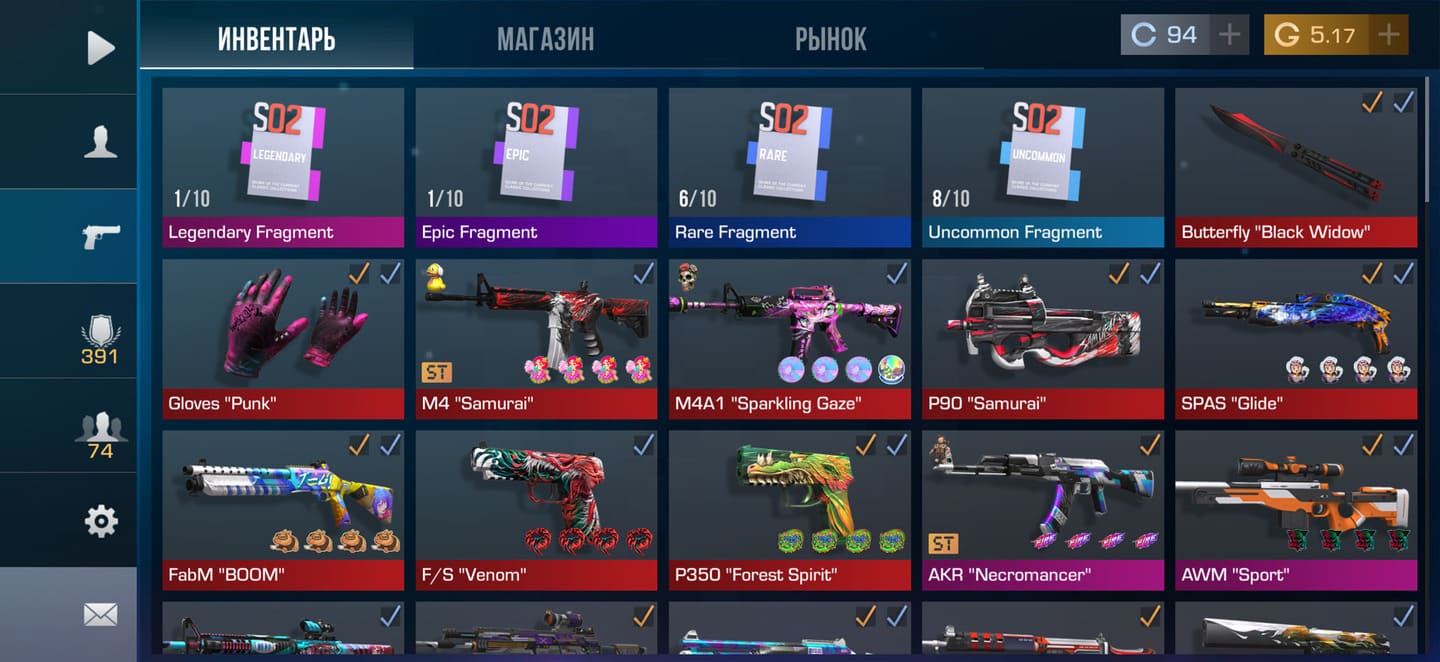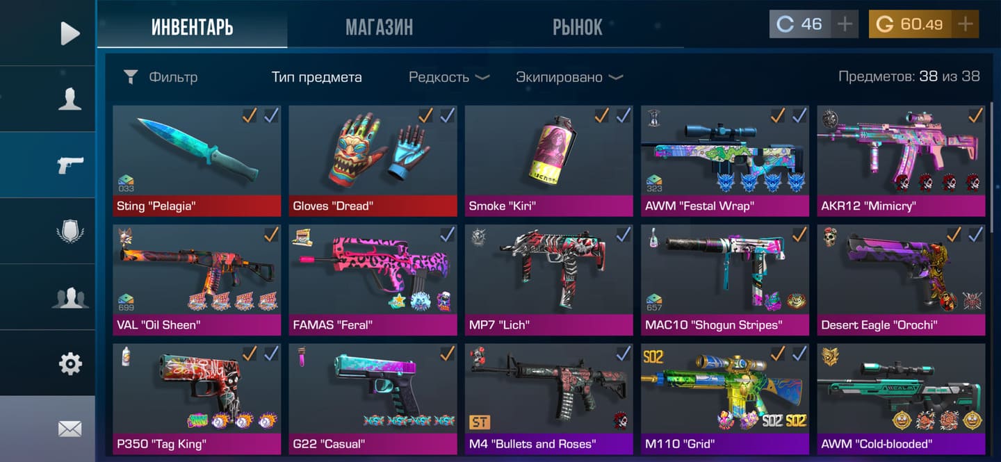 💰Голда: 27.02; 🧤Перчатки: "Hanami"; 🔪Ножи: Kunai "Wavesong", jKommando "Plasma" ⭐️Редкие скины: 4