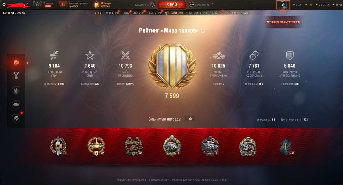 🏆Процент побед: 54% 🎌Число боёв: 10 793 💰Серебро: 2 312 723